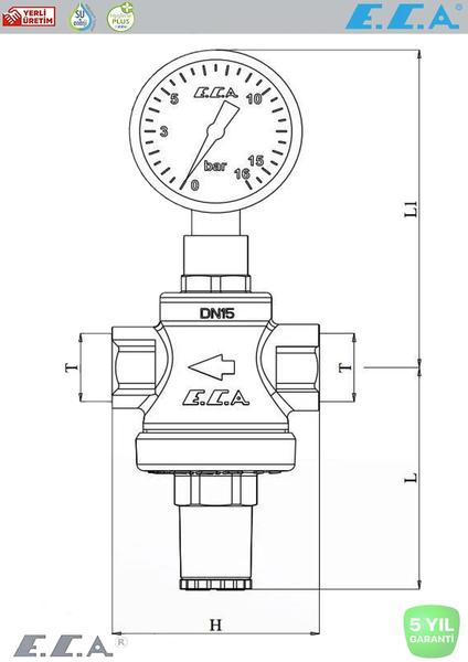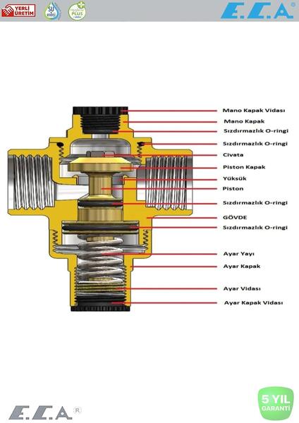 E.C.A 3/4 Manometreli Basınç Düşürücü Valf Pistonlu Iç Vida ECA Basınç Düşürücü 3/4602111010 ; ; *ÜRÜN KODU:602111010 ; *ÜRÜN ADI:Eca Manometreli Basınç Düşürücü Valf ; *BAĞLANTI SEÇENEKLERİ:İç Vida x İç Vida ; *TESİSAT BAĞLANTISI:3/4" ; *İLGİLİ STANDART:TS EN 1567 ; *MAX ÇALIŞMA SICAKLIĞI:+80°C ; *ÇALIŞMA BASINCI:16 bar ; *AYAR BASINCI:1-5 bar ; *GARANTİ SÜRESİ:5 Yıl ; *NOT:Pistonlu ; *NOT:Çıkış basıncını görmek için manometresi mevcuttur ; *NOT:Montajı yapılmış ve ambalajı hasar görmüş ürünlerde iade işlemi yapılmamaktadır ; ; Ürününlerimiz belirtilmiş olan garanti süreçleri içerisin de ücretsiz olarak E.c.a yetkili servis ekiplerince ve servisleri tarafından hizmet verilmektedir. ; E.c.a Merkez servis numarası : 444 0 322 nolu numaradan detaylı bilgi ve destek alabilirsiniz. ; *5 yıl garantili. ;