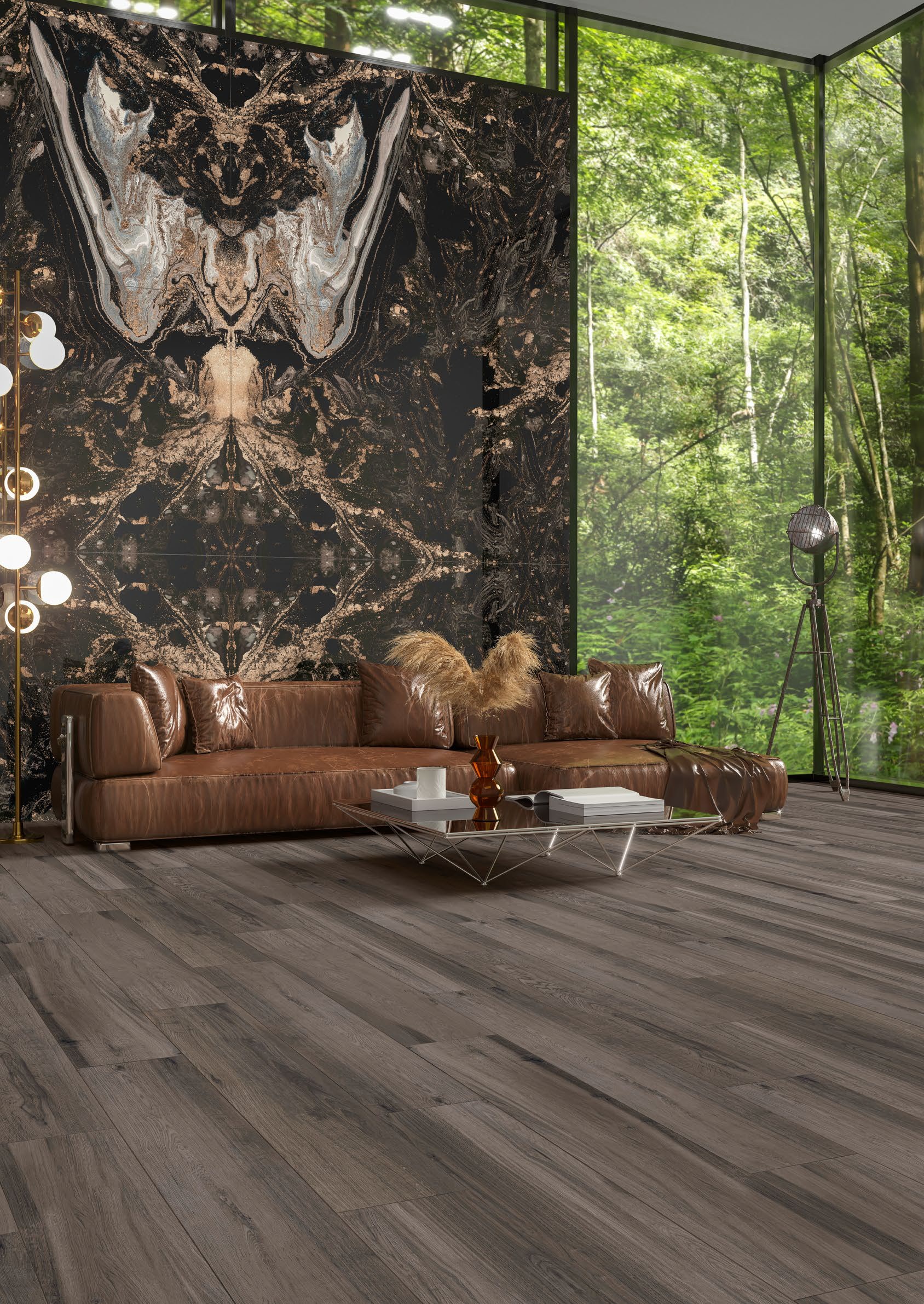 Bien Magnifique Bookmatch 120x180 cm Teknik Porselen Karo, siyah zemin üstünde altın yaldızlı bookmatch simetrik desenli yüzeyiyle lüks mekanlara eşsiz bir odak noktası sunan yüksek kaliteli teknik porselen karodur.
